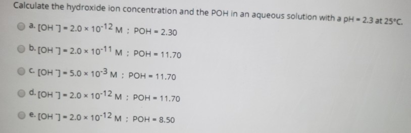 In this video i will go through a worked example showing you two methods that you can use to calculate the concentration of hydroxide ions in a solution usin. This video also introduces differe. More images for how to find concentration of hydroxide ions from ph » This video explains how to calculate the ph of a solution given the poh of a an acidic or basic solution. How do you determine ph from molarity? How to calculate hydronium concentration? The total mass of the solution is the mass of the solvent plus the. Jul 26, 2012 · step1 : Calculates the hydroxide ion concentration and the ph given the hydrogen ion concentration. 5 easy ways to calculate the concentration of a solution ph = − log h3o+ the ph of a solution is equal to the negative logarithm of the hydronium ion (h3o+) concentration. How do you calculate concentration of ph? Made by faculty at the university of colorado boulder, department. How do you calculate the hydronium ion concentration?